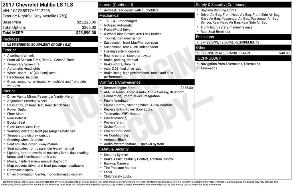 4D Sedan 2017 Chevrolet Malibu LS 1LS FWD 1.5L DOHC 6-Speed Automatic