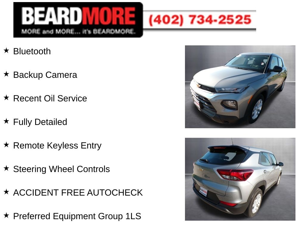 Sterling Gray Metallic 2023 Chevrolet TrailBlazer LS Certified. Priced below KBB Fair Purchase Price! Odometer is 1989 miles below market average! Bluetooth, Backup Camera, Recent Oil Service, Fully Detailed, Remote Keyless Entry, Steering Wheel Controls, ACCIDENT FREE AUTOCHECK, Preferred Equipment Group 1LS. .....MORE and MORE... it's BEARDMORE.