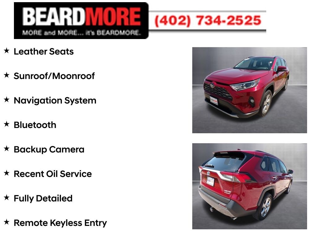 Ruby Flare Pearl 2020 Toyota RAV4 Hybrid Limited Certified. Priced below KBB Fair Purchase Price! Leather Seats, Sunroof/Moonroof, Navigation System, Bluetooth, Backup Camera, Recent Oil Service, Fully Detailed, Remote Keyless Entry, Heated Seats, Steering Wheel Controls. .....MORE and MORE... it's BEARDMORE.