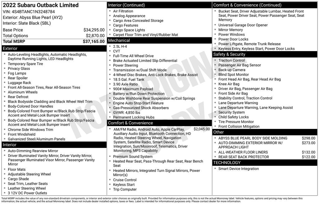 Abyss Blue Pearl 2022 Subaru Outback Limited Certified. Odometer is 11396 miles below market average! Leather Seats, Sunroof/Moonroof, Navigation System, Bluetooth, Backup Camera, Tinted Windows, Recent Oil Service, Fully Detailed, Remote Keyless Entry, Heated Seats, Premium Audio, Steering Wheel Controls, ACCIDENT FREE AUTOCHECK. .....MORE and MORE... it's BEARDMORE.