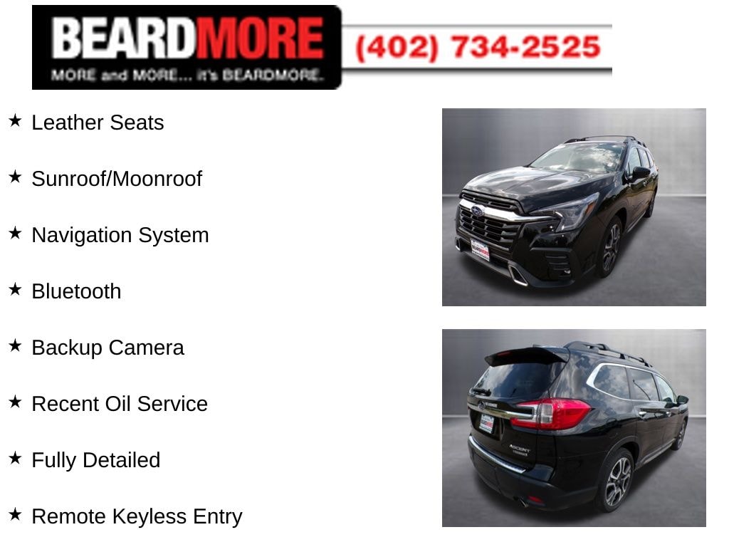 Crystal Black Silica 2024 Subaru Ascent Touring Certified. Priced below KBB Fair Purchase Price! Leather Seats, Sunroof/Moonroof, Navigation System, Bluetooth, Backup Camera, Recent Oil Service, Fully Detailed, Remote Keyless Entry, Heated Seats, Premium Audio, Steering Wheel Controls, ACCIDENT FREE AUTOCHECK, Navigation System, Standard Model. .....MORE and MORE... it's BEARDMORE.