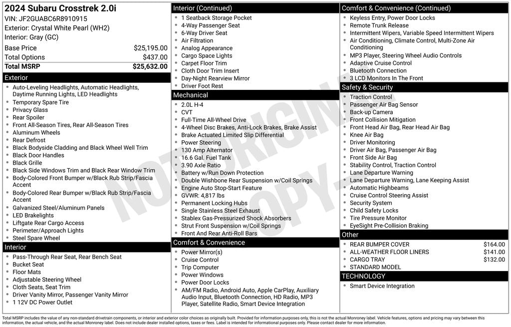 Crystal White Pearl 2024 Subaru Crosstrek Base Recent Arrival! Odometer is 11273 miles below market average! Recent Oil Service, Fully Detailed. .....MORE and MORE... it's BEARDMORE.